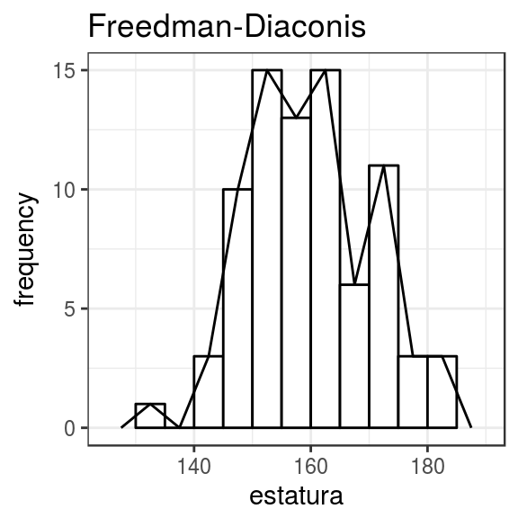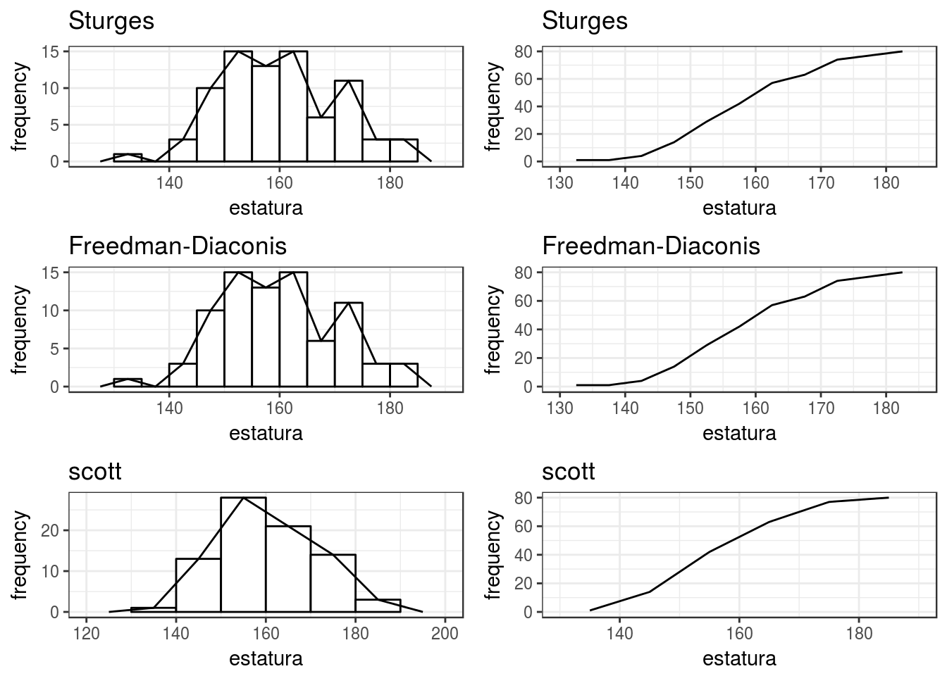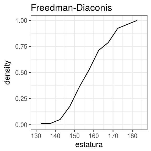 plot_freq(estatura, nclass = "FD", density = TRUE, cfp = TRUE)